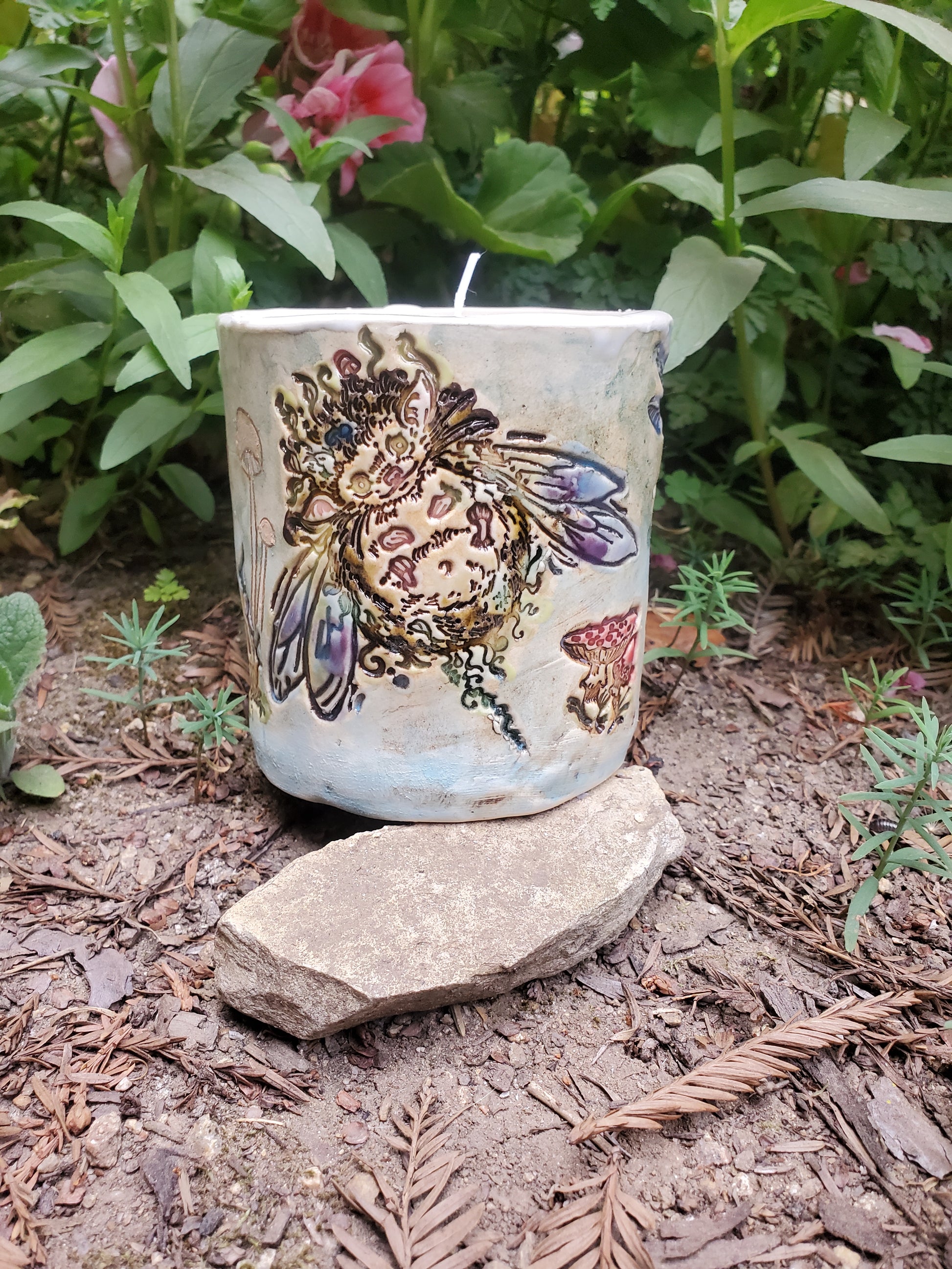 Handcrafted ceramic vessel decorated with whimsical fairies. Choose from 3 different designs and sizes. Each candle is filled with soy wax and has a sweet and fruity sugarplum scent.